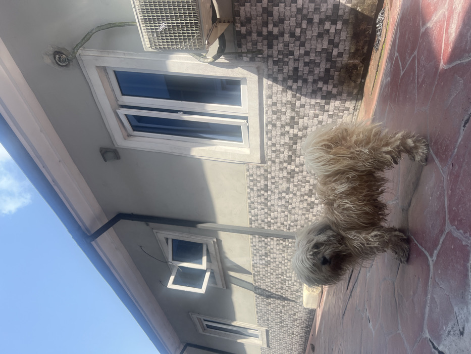 In Rumuofa, Nigeria, an exterior scene depicts a light-brown, shaggy-haired dog, resembling a Shih Tzu, standing centrally on a reddish-brown tiled patio