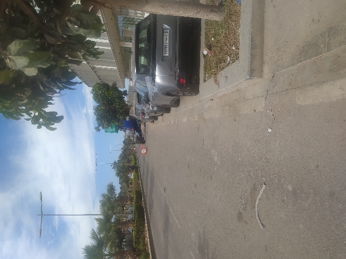The image presents a daytime urban street scene in Casablanca, Morocco, viewed from a low angle looking down a multi-lane asphalt road under a blue sky with scattered white clouds. On the right side of the frame, a concrete curb separates the roadway from a paved sidewalk and a narrow planter containing dry grass and litter, including a red aluminum can and white plastic fragments. A large tree with green foliage partially obscures the upper right. Several vehicles are parked bumper-to-bumper along the curb. The closest is a silver SUV with a Moroccan license plate displaying "993R5 | 16". Behind these vehicles, a modern building with a light-colored facade and large, reflective windows is visible. The asphalt roadway exhibits scattered debris, including a distinctive curved white object, approximately 30-40 cm long, and several smaller white and grey fragments. Further down the road, positioned near a central median, is a red and white circular sign on a stand. Behind this sign, a blue and green utility or construction vehicle with an elevated component is parked. The left side of the scene features a wide, landscaped median strip populated by numerous palm trees and green bushes. Multiple tall streetlights with double-arm fixtures are spaced along this median. In the distant background, a lone individual is visible walking on the far side of the median. No direct actions or interactions are clearly discernible among the sparse human presence.
