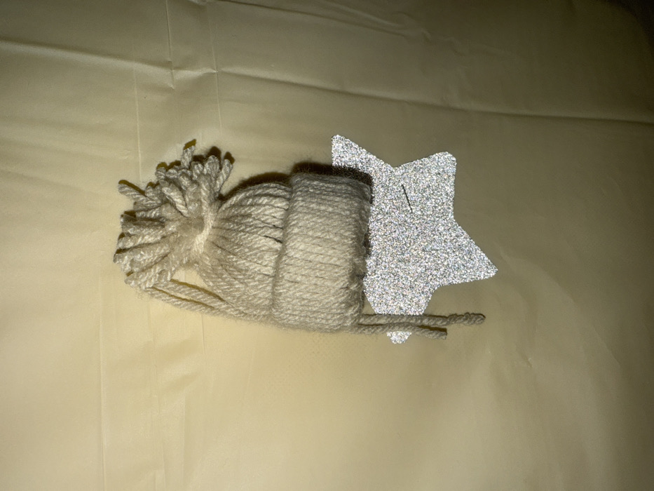 A beige yarn ball with a fluffy end and a shiny star-shaped cutout rest on a smooth, creamy surface. The yarn ball is neatly wrapped, resembling a small bundle or package. The star, covered in shimmering glitter or a reflective material, has a pointed shape and smooth edges. The surface underneath has subtle creases and a glossy finish.