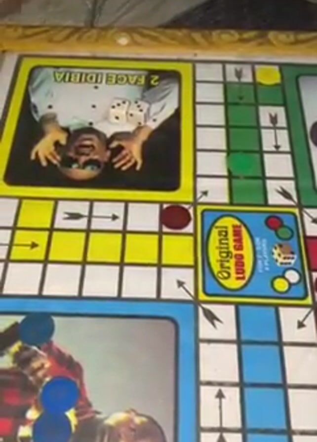 A hand shakes a dice cup and then rolls the dice onto a Ludo board. The Ludo board has images of people on each quadrant. The rolled dice show the numbers two and five.