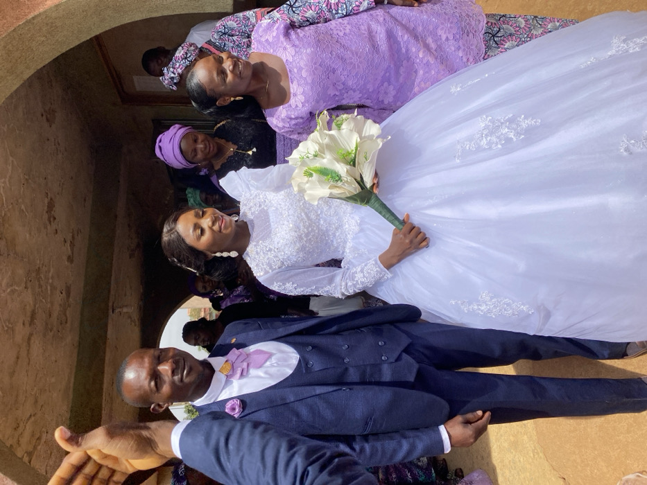 An outdoor scene in Bukuru, Nigeria, features a group of individuals, primarily a man and two women, positioned beneath a light brown masonry archway. The central figure is a man with dark skin and short dark hair, wearing a navy blue three-piece suit, a white dress shirt, a light purple bow tie, and a purple rose boutonniere on his left lapel. He stands facing forward, with a slight smile, looking towards his left. To his right stands a woman with dark skin and dark hair styled with an accessory. She wears a long-sleeved white ball gown adorned with lace and beadwork. She holds a bouquet of white calla lilies with green foliage in her right hand. She looks down and to her right with a soft smile and wears dangling, silver-colored earrings. To the right of the woman in the white gown, another woman with dark skin and pulled-back hair wears a light purple lace dress with patterned sleeves. She smiles, looking towards the woman in white. In the upper left foreground, a raised human hand, palm facing outward, is partially visible. Multiple indistinct figures, mostly women in various attire including purple headwraps and patterned dresses, are visible in the background, partially obscured by the archway. The ground surface in the foreground is light brown, appearing unpaved. The lighting suggests bright daylight.