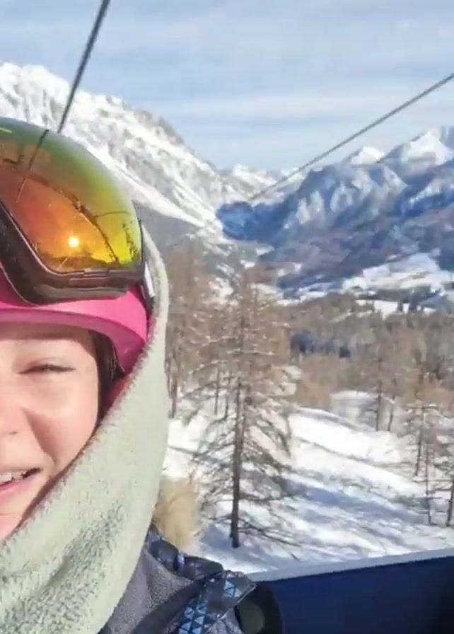 A young woman is on a ski lift, smiling at the camera. She is wearing a pink helmet, ski goggles, and a gray neck warmer that frames her face. The sun is reflecting in her goggles. She is also wearing a dark jacket with a geometric pattern. The background shows a snowy mountain landscape with trees and a blue sky with some clouds. The ski lift cable and support structures are visible.