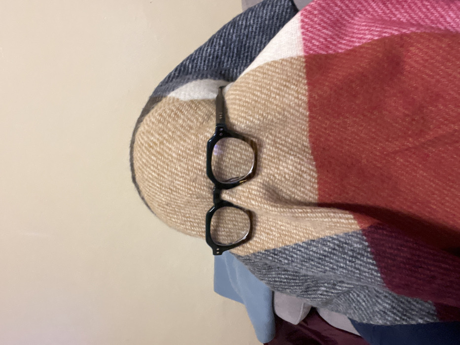 A folded plaid blanket hangs against a pale wall. The blanket features large squares in red, tan, navy, and white. A pair of black-rimmed glasses rests perched on the blanket, near the edge where the tan and navy sections meet. Other articles of clothing can be seen below the blanket in light blue, white, purple, and navy.