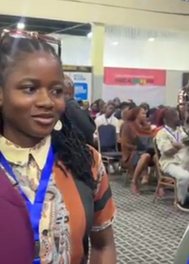 woman with dark hair and brown skin wearing a patterned shirt and a blue lanyard around her neck. She is standing and talking to a man wearing glasses and a grey shirt with a blue lanyard. A man in a purple shirt walks between them. They are in a large indoor space that appears to be a conference or convention. There are many people seated in the background. The space is well-lit with natural and artificial light. There are signs and banners visible in the background.