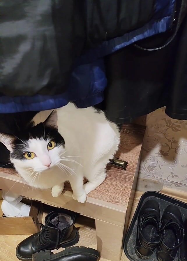 white cat with black markings sitting on a wooden shoe rack. The cat is under a hanging black jacket with a blue lining. A hand reaches towards the cat and pets its head, causing the cat to stretch upwards into the jacket. The cat then licks its mouth and looks down. Around the shoe rack, there are pairs of black boots and shoes on a tray. The background shows a wall with patterned wallpaper.