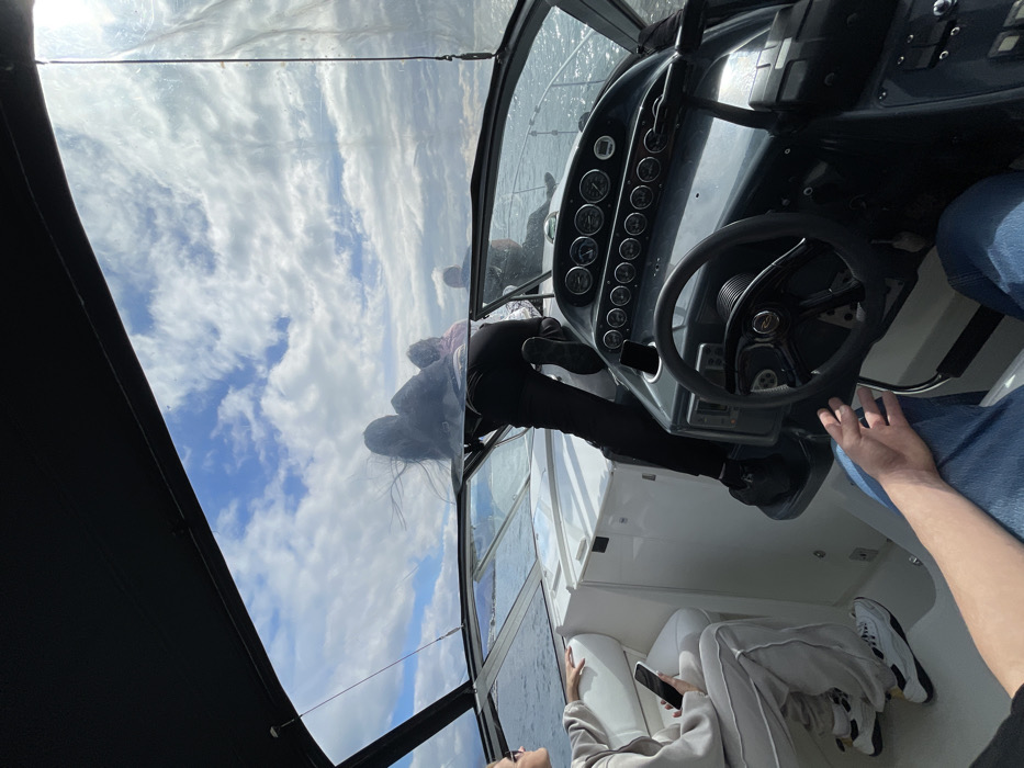 The image depicts an interior view from a motor yacht actively underway in a body of water adjacent to Sirius, Russia. The sky overhead presents a mix of blue and scattered white cumulus clouds. Distant land with mountainous features is visible on the forward horizon. The boat's interior features a dark grey helm station on the starboard side, equipped with a black steering wheel, multiple analog gauges (including speed and RPM), and various control switches. A dark-colored smartphone is visible within a cup holder on the helm. White upholstered bench seating is present on the port side. A black overhead canopy and transparent plastic side panels enclose the cabin area. Five individuals are visible within the frame. In the immediate foreground, the lower legs and right arm of a person wearing blue jeans are visible. On the port side, a female wearing a light-colored sweatsuit and white sneakers is seated, looking leftward while holding a dark-colored smartphone. Sunglasses are positioned on her head. Centrally, a female with long, dark, wind-blown hair, dressed in black pants and a dark top, is leaning forward over the boat's bow area, with her right foot positioned on a step. Partially obscured behind her, another female with wind-blown hair and a light-colored top is also oriented forward. Further forward, an additional individual, appearing male and wearing a dark top, is seated with his back to the camera. The individuals are observing the surrounding environment as the vessel traverses the water.