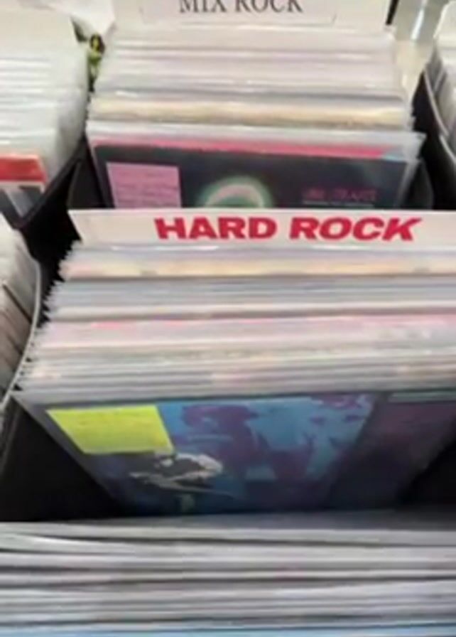 two black bins full of vinyl records, neatly arranged and sorted by genre, "Mix Rock" and "Hard Rock" respectively
