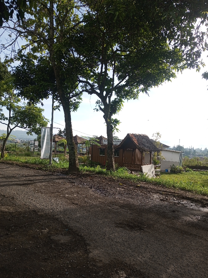 A rural scene depicts an unpaved road leading towards a collection of small buildings, including a brown wooden structure with a tiled roof and shipping containers. Lush trees with dense foliage frame the scene, casting shadows on the road. In the background, a distant hillside dotted with houses and structures is visible. Grass and vegetation line the edges of the road.