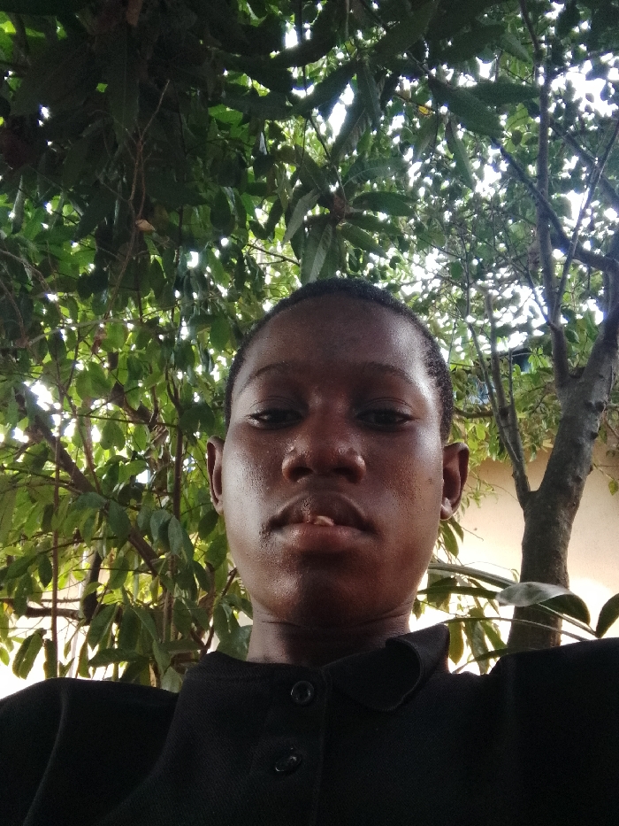 A close-up portrait depicts a single individual, a young person with dark skin and short dark hair, facing directly forward. The individual wears a black collared shirt with two visible buttons. Their expression is neutral, and they gaze directly at the camera. A slight gap is present between the upper front teeth. The background consists predominantly of dense green tree foliage, with natural light filtering through the leaves, creating bright highlights. A tree trunk is partially visible to the right, and a light-colored building wall is discernible in the distant background. The scene is outdoors, at an unknown specific location within the city of Unknown, Unknown.