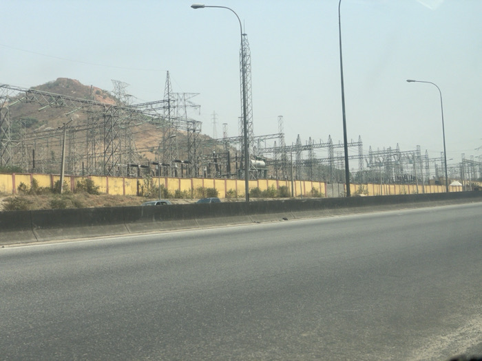 The image displays an electrical substation located alongside a multi-lane asphalt road in Jiru, Nigeria