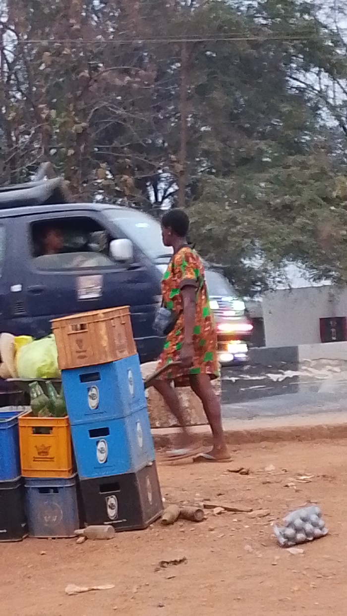 - "A woman in a patterned dress walks past a stack of crates near a roadside" by FM-gtXld2, licensed under CC BY 4.0