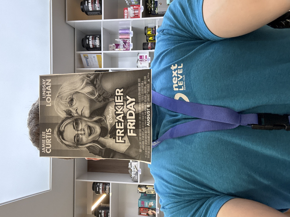 An individual, visible from the upper torso, stands within a "Next Level fitness club" facility in Sofia, Bulgaria. They wear a teal-colored short-sleeved t-shirt featuring the club's white logo on the right chest and a purple lanyard with a black plastic buckle around their neck. Their face is completely obscured by a vertically held black-and-white movie poster for "Disney FREAKIER FRIDAY," starring Jamie Lee Curtis and Lindsay Lohan, with "AUGUST 8" printed as a release date. The poster depicts two women: one with light hair and sunglasses smiling broadly, and another with lighter hair and glasses leaning close to the first. Short, dark hair is visible above the top edge of the poster. The background reveals a brightly lit interior with white shelving units stocked with various fitness supplements and products, including large black tubs labeled "ISOLATE," smaller colored bottles, and cans, some displaying price tags. A vertical illuminated strip is present on a dark wooden panel to the far left. The ceiling is plain white.