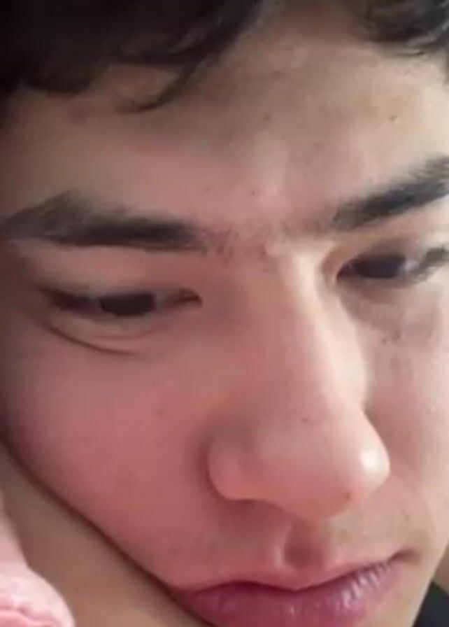 A close-up shot shows a person's face. The person has dark hair and brown eyes. The face appears slightly tired or subdued. A pink fabric is visible on the left side of the frame, suggesting the person might be resting their head on something soft. The lighting appears natural.