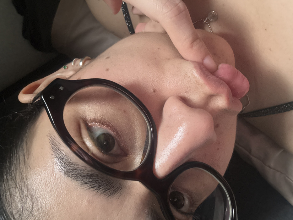 A close-up, tilted view shows a person with dark-framed glasses, looking directly at the camera with one eye clearly visible. Their tongue is extended, being touched by a finger. The person has fair skin with freckles. A small necklace is visible. Other ear piercings are also visible.