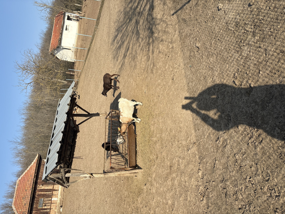 This image captures an outdoor scene in Knezha, Bulgaria, under a clear blue sky and bright sunlight. The ground is dry, light brown earth with minimal vegetation. In the mid-ground, a rudimentary shelter with a corrugated metal roof is supported by wooden posts, covering a metal feeder. Three goats are present near the feeder: a predominantly white goat with brown markings is positioned at the feeder, seemingly eating; a smaller white goat is visible inside the feeder behind the first; and a dark-colored goat is partially obscured behind the feeder. To the right of the feeder, a dark brown goat stands facing left. In the upper left background, a two-story structure with brown wooden siding and a red-tiled roof is visible. To the upper right, a smaller, single-story white building with a red-tiled roof stands, separated by a sparse pole fence. Deciduous trees, currently without leaves, form a dense line in the distant background. The shadow of the photographer, holding a smartphone, is prominently cast in the lower foreground, extending from the bottom center.