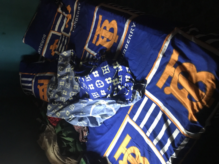 The image depicts an interior scene within a bedroom located in Oba-Ile, Nigeria. The primary subject is an unmade bed, covered by blue bedding adorned with a repeating pattern of large orange 'TB' monograms, white horizontal stripes, and the word "BURBERRY" in white capital letters. Several pillows, some matching the bedding pattern, are visible at the head of the bed. Two pieces of fabric displaying a repeating Louis Vuitton monogram pattern (quatrefoil, circle, flower, diamond shapes) are draped across the center of the bed; one is a lighter blue with darker monograms, and the other is a darker blue with lighter monograms. In the upper left quadrant, a crumpled pile of additional fabrics or clothing items, including beige, dark green, and a hint of red, rests on the bed. The room is dimly lit, with a portion of a light blue/teal wall visible in the upper left background. No individuals, actions, or interactions are present in the frame.
