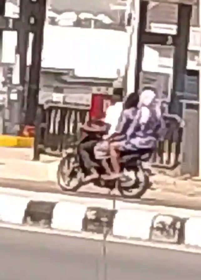 A video shows a street scene. First, a motorcycle with two riders passes by. Then a yellow three-wheeled vehicle, possibly a tuk-tuk, appears with a passenger. The motorcycle returns and a man walks in the same direction. Buildings are visible in the background.
