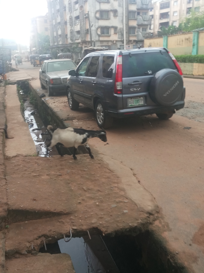 The image depicts an urban street scene in Onitsha, Anambra State, Nigeria. In the foreground, a black and white goat stands on an unpaved shoulder, adjacent to an open concrete drainage ditch filled with dark water and debris. In the midground, a dark grey Honda CR-V SUV is parked facing away from the viewer on the unpaved street, displaying an Anambra State license plate, "AGU 185TP." A spare tire is mounted on the vehicle's rear door. Behind the CR-V, a silver Mercedes-Benz sedan is also parked. The street surface is predominantly unpaved earth and gravel with evidence of worn asphalt. In the background, multi-story, concrete buildings with weathered facades line the street, some featuring externally mounted air conditioning units. Further down the street, additional vehicles, including what appear to be auto-rickshaws (Keke Napep), and distant human figures are visible.