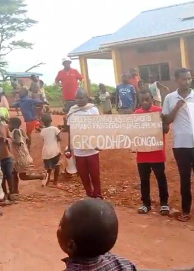 A crowd of people, primarily children, stands outside a building with a light blue roof. Some individuals hold banners with writing on them. One banner reads, "GROUPE CONSULAIRE DES DROITS HUMAINS PROTECTION ET DEVELOPPEMENT GRCDHPD-CONGO Asb." Another banner displays "AMANI NA KUPIGANISHA. GRADEP. ASBL VITENDO VYA UJEURI TERRITOIRE DE FIZI RDC SUD-KIVU FIZI LE 25/11/2023" along with a graphic of an AK-47. Some people clap their hands. One man records the scene with his phone. The environment appears to be a village or rural area with a red dirt road.