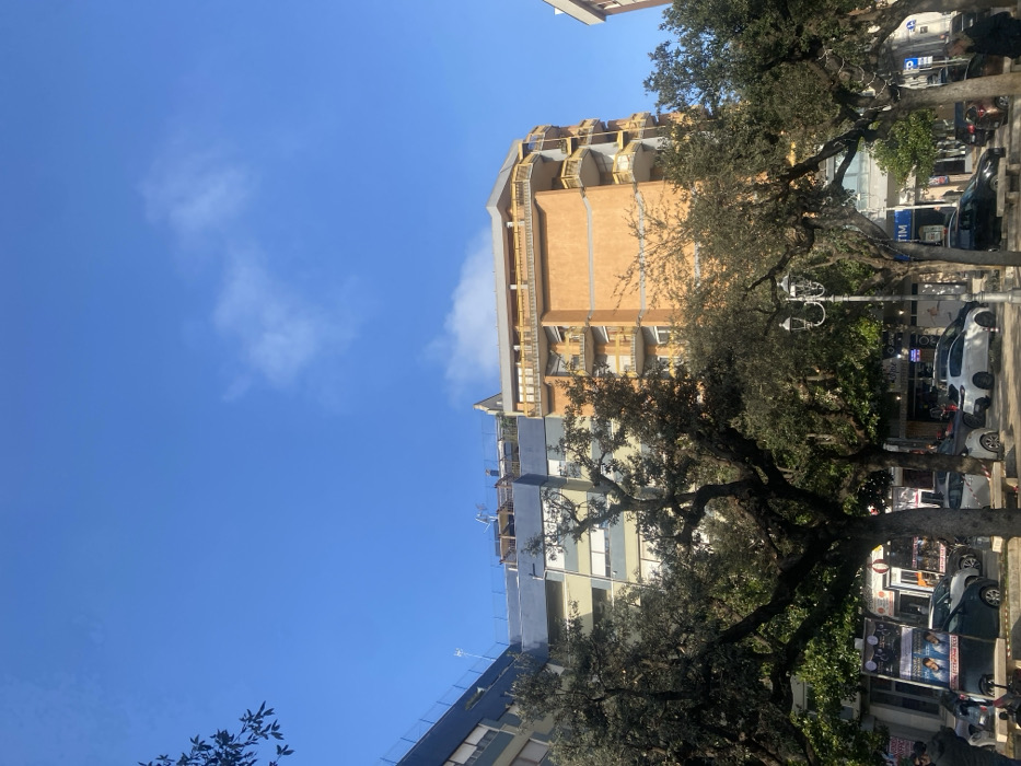 The scene depicts an urban environment in Brindisi, Italy, under a clear blue sky with minimal, wispy white clouds. The primary visual elements include multi-story buildings, dense trees, parked vehicles, and a few individuals. In the background, two prominent multi-story buildings dominate the skyline. The building on the left features a blue-grey upper facade and lighter lower levels. Its rooftop is equipped with a visible protective netting or fence, various structures, and two human figures standing near the center, facing generally towards the right. Adjacent to this, on the right, is a distinct multi-story building with an orange-colored facade and multiple curved balconies, each featuring light-colored railings. The mid-ground and foreground are heavily populated with numerous, mature deciduous trees, characterized by dark, gnarled trunks and branches supporting dense, dark green foliage. These trees partially obscure the lower sections of the buildings and the street level. Beneath the trees, a paved street runs horizontally. Numerous vehicles are parked along the street, including white, dark grey, and light green cars. Storefronts with commercial signage, including a "TIM" logo, are visible behind the parked cars and trees. A decorative black streetlamp with multiple light globes stands centrally among the trees. At ground level, a light-colored bench is visible to the left. On the far left, a person in dark clothing is partially visible, while another individual in dark attire is partially visible on the far right. No explicit interactions are discernible among the individuals.