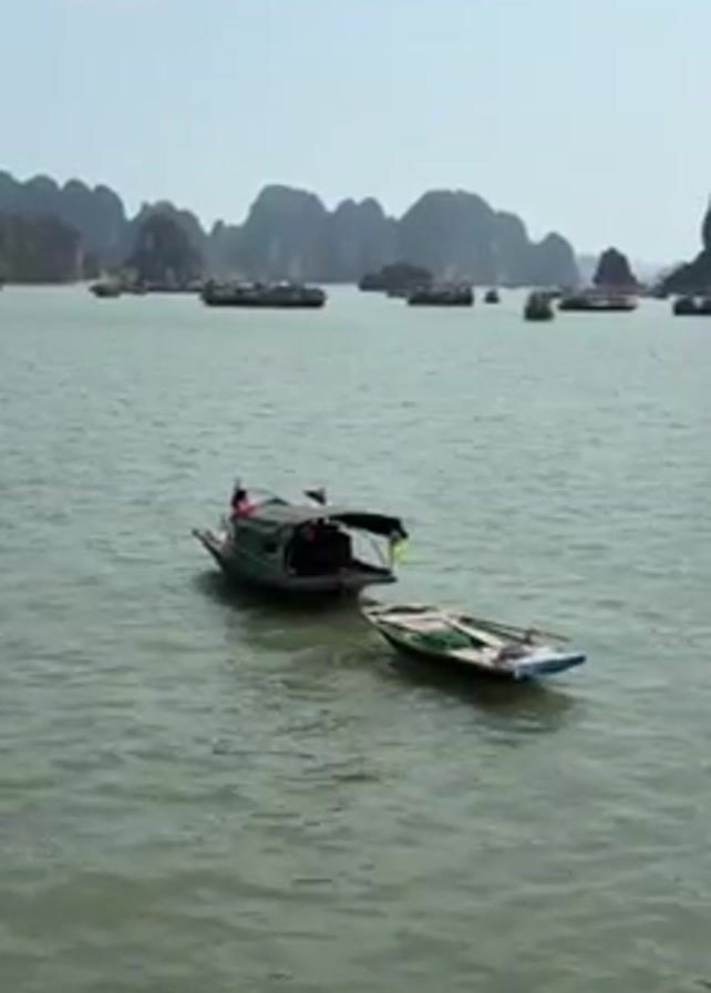 seascape with numerous limestone karsts rising from the water. A small boat with a partially open canopy is in the foreground, towing another smaller, less substantial boat behind it. Several other boats are visible scattered in the distance among the islands. The water is a slightly greenish-grey color, and the sky is a light blue.