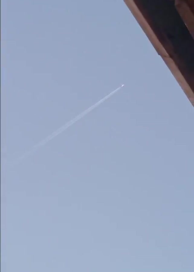 white jet airplane flying high in a clear, pale blue sky. The airplane is leaving a long white contrail behind it. The camera angle shifts and a portion of a wooden structure is visible in the corner of the frame, partially obscuring the view of the sky. The video ends with a blurred close-up of a foot in a pink sock and blue shoe. There is some indistinct chatter audible in the background.