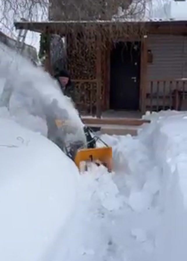 A man clears a snow-covered path to a house, using a yellow snow blower. He is wearing a dark jacket, gloves, and a hat. The house has a covered porch with a pile of firewood visible on one side. The yard is deeply covered in snow, forming high walls on either side of the path. The snow blower throws a stream of snow to the side as the man walks forward.