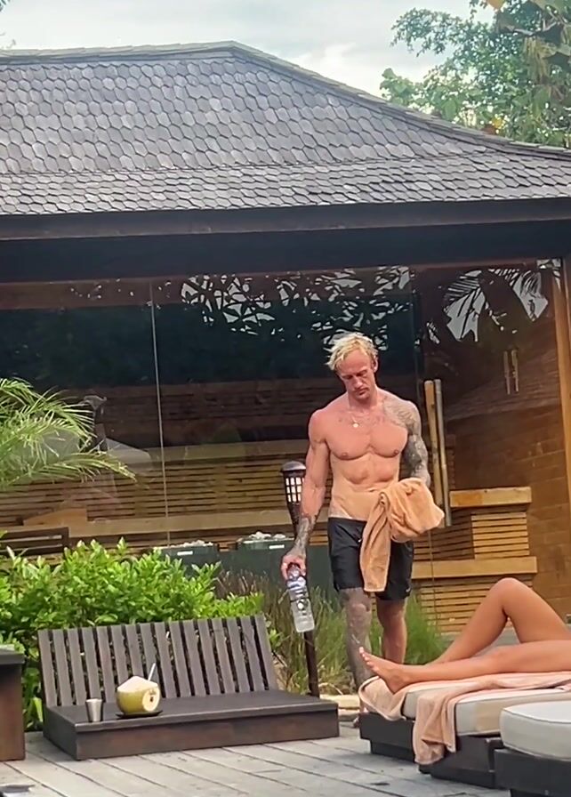 shirtless, muscular man with blond hair and tattoos walking toward the camera next to a pool. He is carrying a water bottle and a towel. Next to the pool is a dark wood patio with a chaise lounge chair, a bench with a coconut drink on it, and a wooden structure. Someone is lying on the chaise lounge, with their legs visible. The sky is overcast.