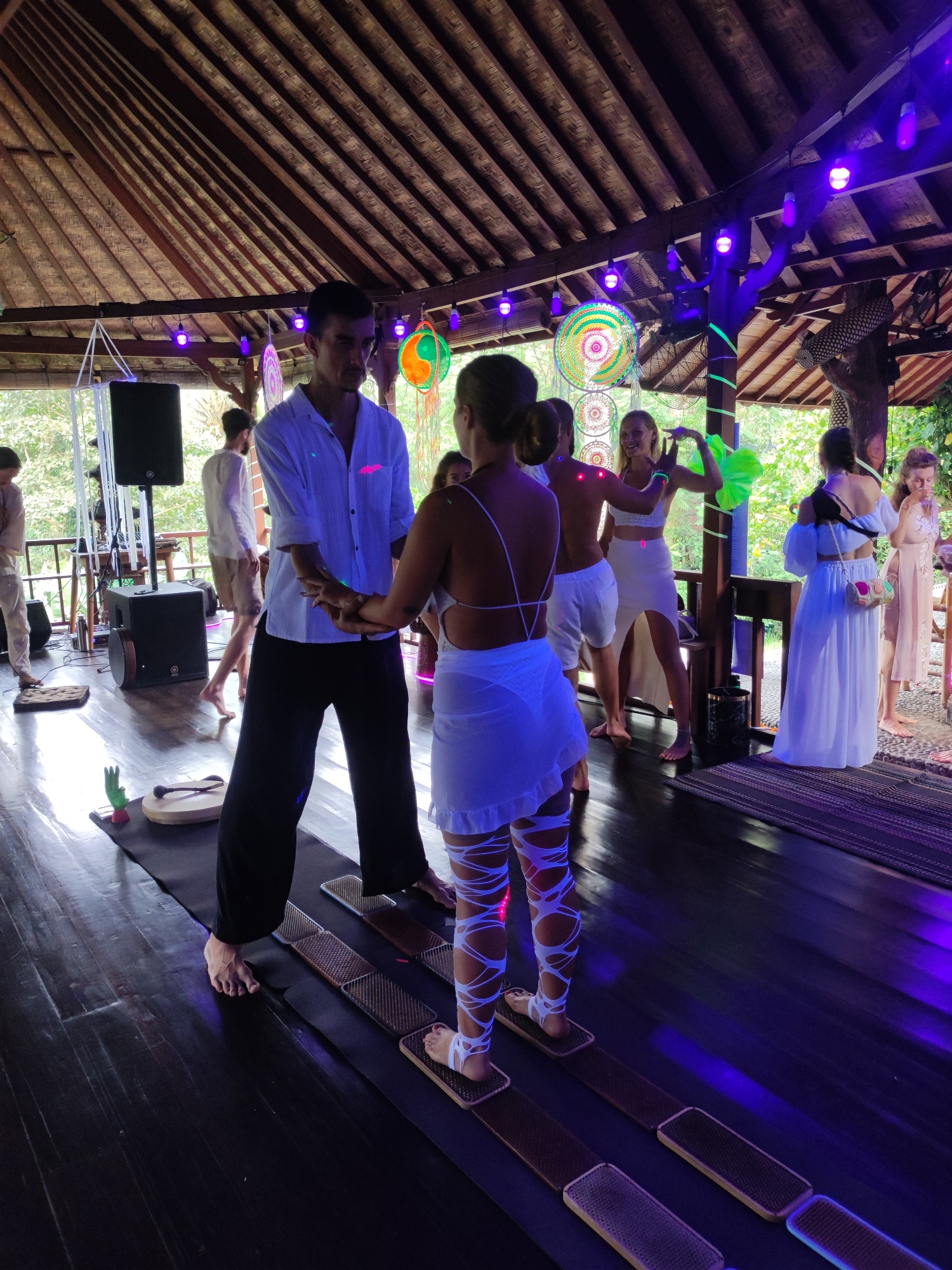 The scene depicts an indoor wellness gathering or workshop within an open-sided wooden structure in Lokaserena, Indonesia. The venue features a high, pitched thatched roof and a dark wooden floor. The environment is illuminated by numerous purple UV string lights, causing white clothing and certain objects to fluoresce brightly. In the immediate foreground, a female subject stands barefoot on two dark brown Sadhu boards, each embedded with numerous nails, placed on a black mat. Her feet are secured to the boards by white fabric wraps that extend up her lower legs, glowing intensely under the UV light. She wears a white backless top with thin straps and a short white skirt with ruffled trim, both fluorescing brightly. She is facing and holding hands with a male subject who stands barefoot on the wooden floor. The male wears a white, collared, long-sleeved shirt, partially unbuttoned, and dark pants; his shirt shows faint pink luminescence. In the mid-ground and background, approximately eight other individuals are present. To the right of the central figures, a woman in a white crop top and a white skirt with a high slit strikes a pose, her attire glowing, and she wears glowing green wristbands. Beside her, a bare-chested male in white shorts displays glowing dots on his back. Further right, a woman in a white off-the-shoulder dress with a black fanny pack observes the scene. Another woman in a light-colored dress with curly hair stands nearby, holding a small object. To the left of the central figures, a man in a white shirt and light shorts walks past a tall black speaker on a stand and a smaller black subwoofer-like speaker, both bearing Yamaha logos. A dark drum is positioned near the subwoofer. Decorative elements include multiple circular woven patterns resembling dreamcatchers, some glowing green, orange, or purple, suspended from the ceiling. A green glowing yin-yang symbol is also visible. A structural post is wrapped with glowing green tape, resembling a tree. A small green, hand-shaped sculpture and a wooden paddle-like object rest on a dark mat near the male subject's feet. The overall ambiance suggests a focused, meditative, or experiential event.
