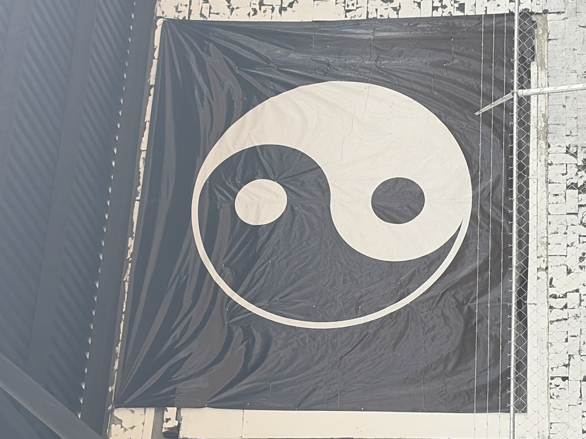 - "The image displays a large, rectangular black banner featuring a prominent white Yin-Yang symbol, affixed to a distressed brick wall with extensive peeling white paint" by FM-ZShVZ2, licensed under CC BY 4.0