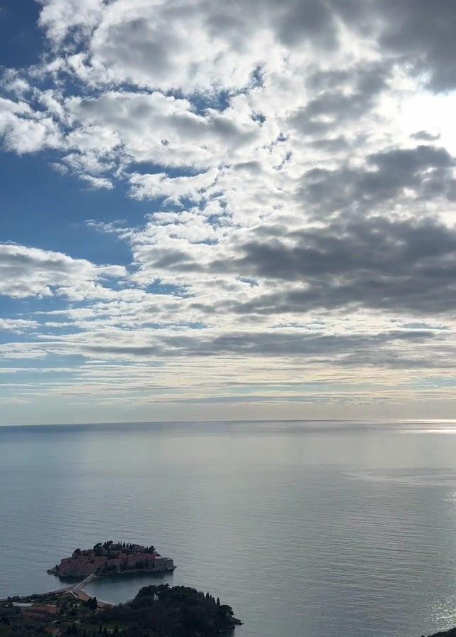The video presents a high-angle, panoramic view of a coastal scene under a dynamic sky