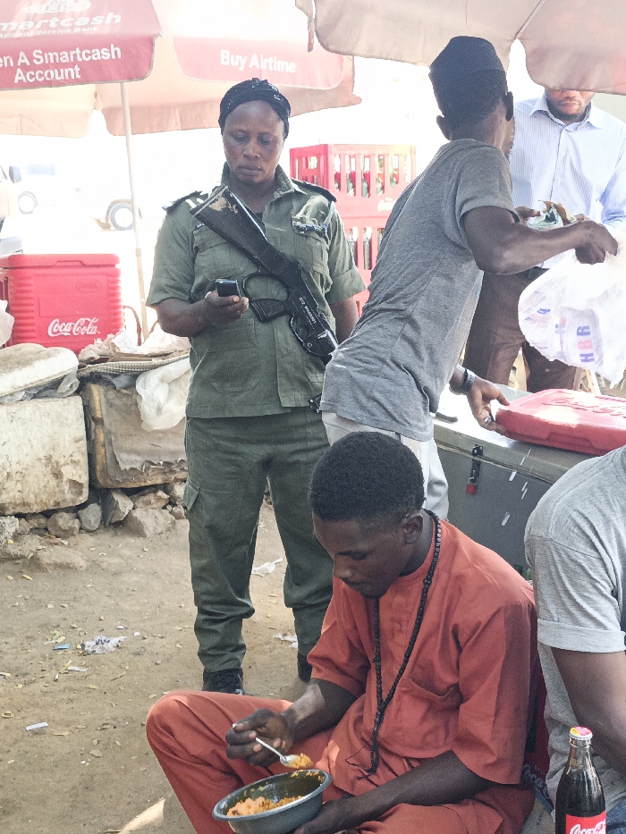 The scene, located in Fagge A, Nigeria, depicts an outdoor market environment under clear daylight. A woman in an olive-green uniform, comprising a short-sleeved shirt, cargo pants, and a dark head covering, stands left of center, focusing on a black smartphone held in her right hand. A black shotgun is slung across her front. To her left, a red Coca-Cola branded cooler rests on the dirt ground, adjacent to stacked, irregular concrete blocks. Above, two red and white commercial umbrellas are visible, advertising "Smartcash" and "Buy Airtime". In the foreground, a man in an orange tunic and matching pants sits on the ground, consuming food from a dark bowl with a spoon. He wears a black beaded necklace. Beside him, a Coca-Cola bottle stands upright. Behind the seated man, a man in a gray t-shirt leans over a dark rectangular cooler, holding a white plastic bag containing multiple items. Further back, a man in a light blue and white striped shirt is partially visible. Red plastic crates are stacked in the background. The ground is unpaved, scattered with minor debris.