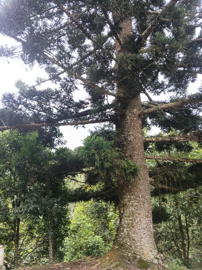 The image depicts a large, mature tree centrally located in a dense, green environment within the city of Munyati, Zimbabwe. The tree features a robust, textured brown-grey trunk with extensive branching supporting a dark green, compact canopy. Visible on the branches are patches of lighter green epiphytic growth. The upper crown is silhouetted against a bright, overcast sky. Below and surrounding the main subject is a thick growth of various green trees and underbrush. The ground directly beneath the tree is reddish-brown earth with minimal ground cover. A partial white or light-colored vertical post is discernible at the lower-left frame edge. No individuals or human activities are present.