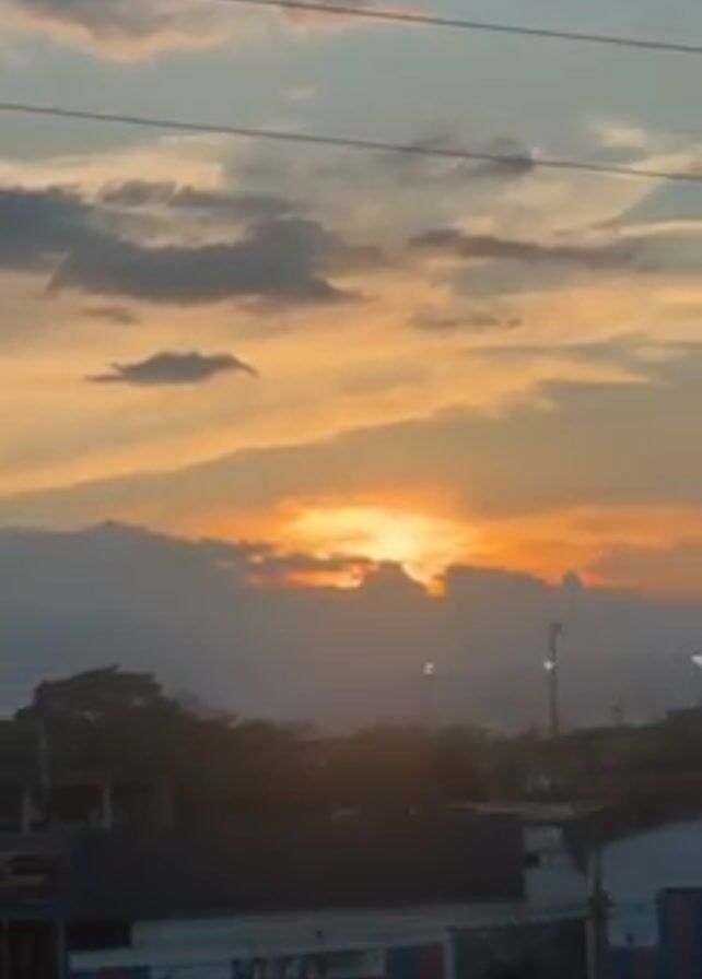 sunset in a city. The sun is setting behind clouds, casting an orange glow across the sky. There are buildings, trees, and street lights visible in the foreground. The camera is panning across the scene. The wind is blowing strongly.