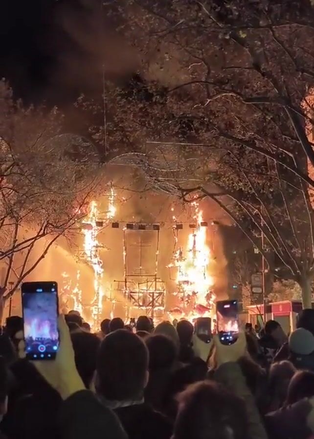 At night, a crowd of people is seen recording a large structure engulfed in flames with their phones. The structure is made of wood and metal and has a geometric design. The fire is intense, with flames reaching high into the sky, creating a plume of smoke. Bare trees surround the scene, silhouetted against the dark night sky.