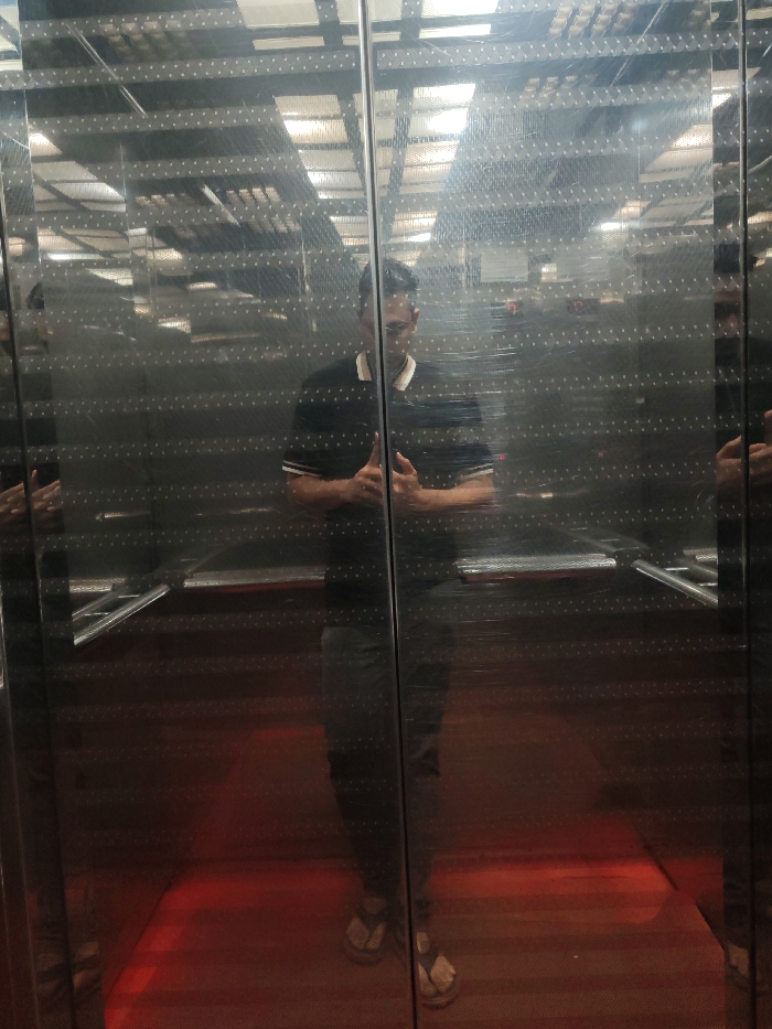 An adult male is observed in a self-portrait captured within an elevator, located in a building in Dhaka, Bangladesh