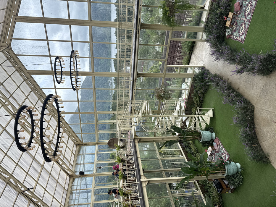 The interior view showcases a sunlit greenhouse with metal framework, large glass panels, and a glimpse of a mountainous landscape. Two ornate circular chandeliers hang from the ceiling. A white spiral staircase connects different levels, adorned with potted plants. The floor features artificial grass, accented with lavender bushes and a patterned rug with pillows, suggesting a cozy relaxation area. People are visible on one of the upper floors, engaging in activities.