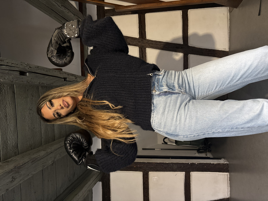 An adult female is depicted standing centrally within an indoor setting. She has long, light brown hair, facial makeup including winged eyeliner and dark lipstick, and a septum nose piercing. She wears a black, textured, long-sleeved cropped sweater with a half-zip and light blue, high-waisted denim jeans. On each hand, she wears a black boxing glove; the left glove appears new, while the right glove exhibits significant wear, scuffing, and material degradation. Her arms are raised and bent at the elbows, positioning the gloves upwards, as she maintains a direct gaze towards the camera. The room's architecture features exposed dark wooden beams on the ceiling and walls, characteristic of half-timbered construction, with white plaster infill panels. The floor is a dark gray. To the left rear, a doorway opens to a darker space where a wheeled object is partially visible. This architectural style is specific to historic buildings in the city of Strasbourg, France.