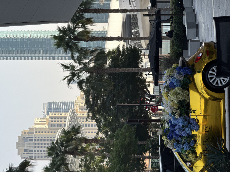 This image captures an outdoor urban environment in Dubai, United Arab Emirates, specifically on Bluewaters Island, facing towards the Jumeirah Beach Residence and Dubai Marina skyline. The primary subject is a customized, metallic gold-wrapped Volkswagen Beetle convertible, positioned in the mid-ground, facing right. The car's entire rear passenger compartment and trunk area are densely filled with a large arrangement of artificial flowers, predominantly consisting of blue, light blue, and yellow-white hydrangeas, interspersed with smaller white flowers and green foliage. The driver's side of the car displays a black "FloBerry" logo in script and the text "FLOBERRYBOUTIQUE". To the immediate left of the gold Beetle, a portion of a dark-colored vehicle is visible. A red circular "STOP" sign, bearing both English and Arabic text, is mounted on a pole located behind the customized car. The immediate surroundings include a paved ground surface and several concrete planters containing green shrubs. Further into the mid-ground, multiple large black outdoor umbrellas extend over outdoor seating areas. Two indistinct individuals are partially visible under one of these umbrellas on the right side. Numerous tall palm trees are distributed throughout the scene. The background features a hazy sky above a modern cityscape. On the left, a multi-story building with light-colored, stepped architectural facades is prominent. Beneath this building, a large, intricate white or silver open-lattice structure is visible, consistent with elements found on Bluewaters Island near Ain Dubai. To the right, a tall, slender skyscraper with a blue-tinted glass facade rises into the sky. Additional modern high-rise buildings are discernible in the distant background.