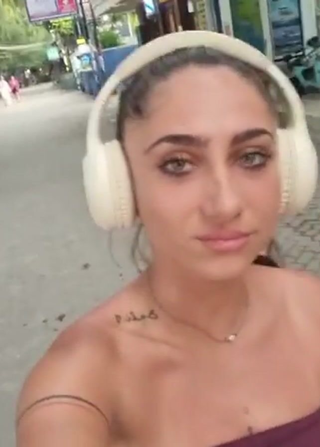 A young woman with dark hair pulled back in a ponytail is taking a selfie video on a paved street. She is wearing large, cream-colored headphones and a maroon strapless top with a light pink floral design. She also has a thin gold necklace and a tattoo on her left shoulder. There is a motorcycle, a green stool, people, and storefronts visible in the background.