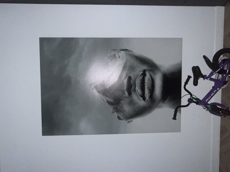 A black and white print hangs on a white wall, depicting a person's face. The face appears to be emerging from clouds or mist. To the right of the print, a purple bicycle is leaning against the wall, partially obscuring the view. The photograph is taken at a slightly skewed angle.