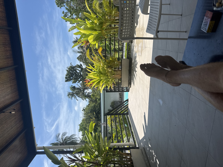 The image captures an outdoor leisure scene from a first-person perspective on a shaded terrace or balcony in Baan Sri Thanu, Thailand