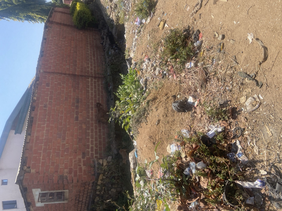 This image depicts an outdoor scene in Jos, Nigeria, characterized by significant environmental degradation. In the foreground, the ground consists of reddish-brown dirt, heavily strewn with an accumulation of litter and debris, including plastic bottles, bags, wrappers, paper, and discarded textiles. Small mounds of earth and various green weeds and plants grow intermittently amidst the refuse. A dark plastic bag is centrally visible on one such dirt mound. A shallow, dark drainage ditch or trench runs horizontally across the midground, separating the foreground from a prominent red brick building. This trench contains further debris and appears to hold dark liquid or stagnant water. The background features a two-story red brick building with a corrugated metal roof. The left side of the building displays a single rectangular window with dark panes and a white frame. The base of the brick wall is constructed with rough-hewn stones. Along the base of this wall, near the drainage ditch, two dogs are present: a larger reddish-brown adult dog stands facing left, and a smaller, lighter-colored dog is partially visible to its left, near the building's corner. No human figures are discernible. To the right, the brick wall continues, exhibiting visible buttresses or structural supports. Beyond the wall, manicured green bushes are visible, followed by the roofline of another light-colored building with a green roof, and the upper section of a tall, dark green coniferous tree against a clear blue sky. The overall scene suggests a residential or semi-urban area affected by widespread waste accumulation under clear, sunny weather conditions.