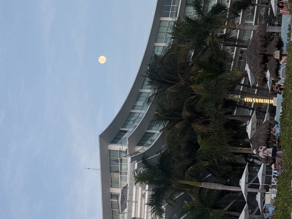 A tall, curved, modern building dominates the scene, with rows of windows and a gray exterior. Palm trees line the side of the building and extend towards the foreground. In the upper left corner of the sky, a bright, full moon is visible. Below, a pool area is visible, populated with umbrellas and tiki huts. People are relaxing and enjoying the poolside amenities.