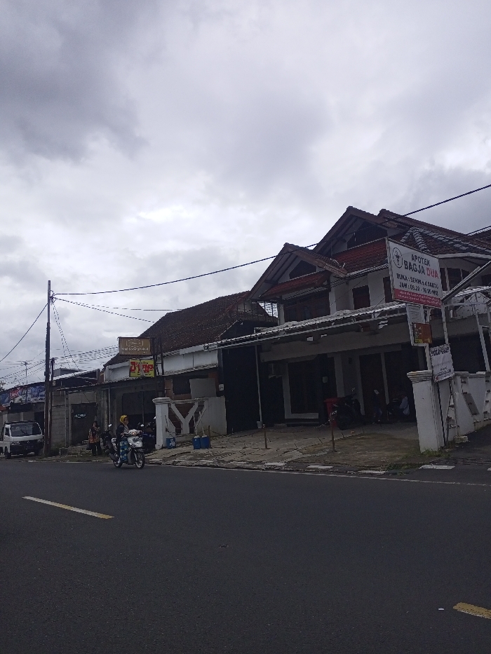 A cloudy street scene shows several buildings along the roadside. A pharmacy sign, "Apotek Bagja Dua," is prominently displayed on a two-story building. Further down, a small group of people stands beside a parked van. A person rides a scooter down the road. A power pole is seen on the side of the road as well.