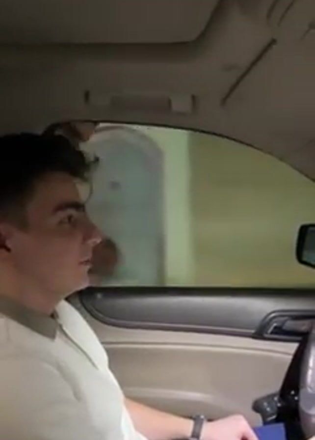 From inside the cab of a car with a sunroof, a seated young man in a white polo shirt and blue jeans looks to the side