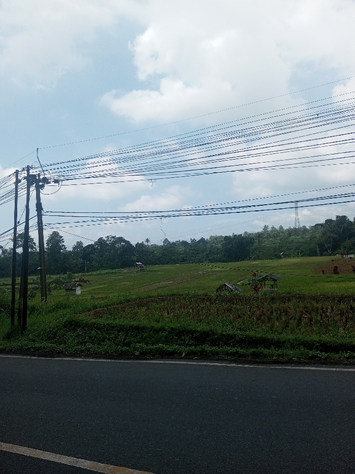 The scene depicts a rural landscape in Niz Lakuk, India, under a partly cloudy sky. In the immediate foreground, a dark asphalt road with a single solid yellow lane marker on its left edge runs horizontally across the bottom of the frame. Beyond the road, a strip of unkempt green grass and weeds transitions into an expansive agricultural field dominated by green crops, possibly rice. To the left, a dark utility pole supports multiple black electrical or communication wires that stretch horizontally across the upper portion of the image. Scattered within the fields are several small, open-sided structures with dark, pitched roofs; one on the far left is a small, white, enclosed shed-like structure, while two others further right are open shelters. The midground shows variations in crop height and density, with some areas appearing recently tilled or harvested. In the background, a dense line of lush green trees forms a horizon, indicative of a forest or heavy vegetation. Above the trees on the right, a tall, grey metal lattice transmission tower is visible. No individuals, animals, or active events are present.