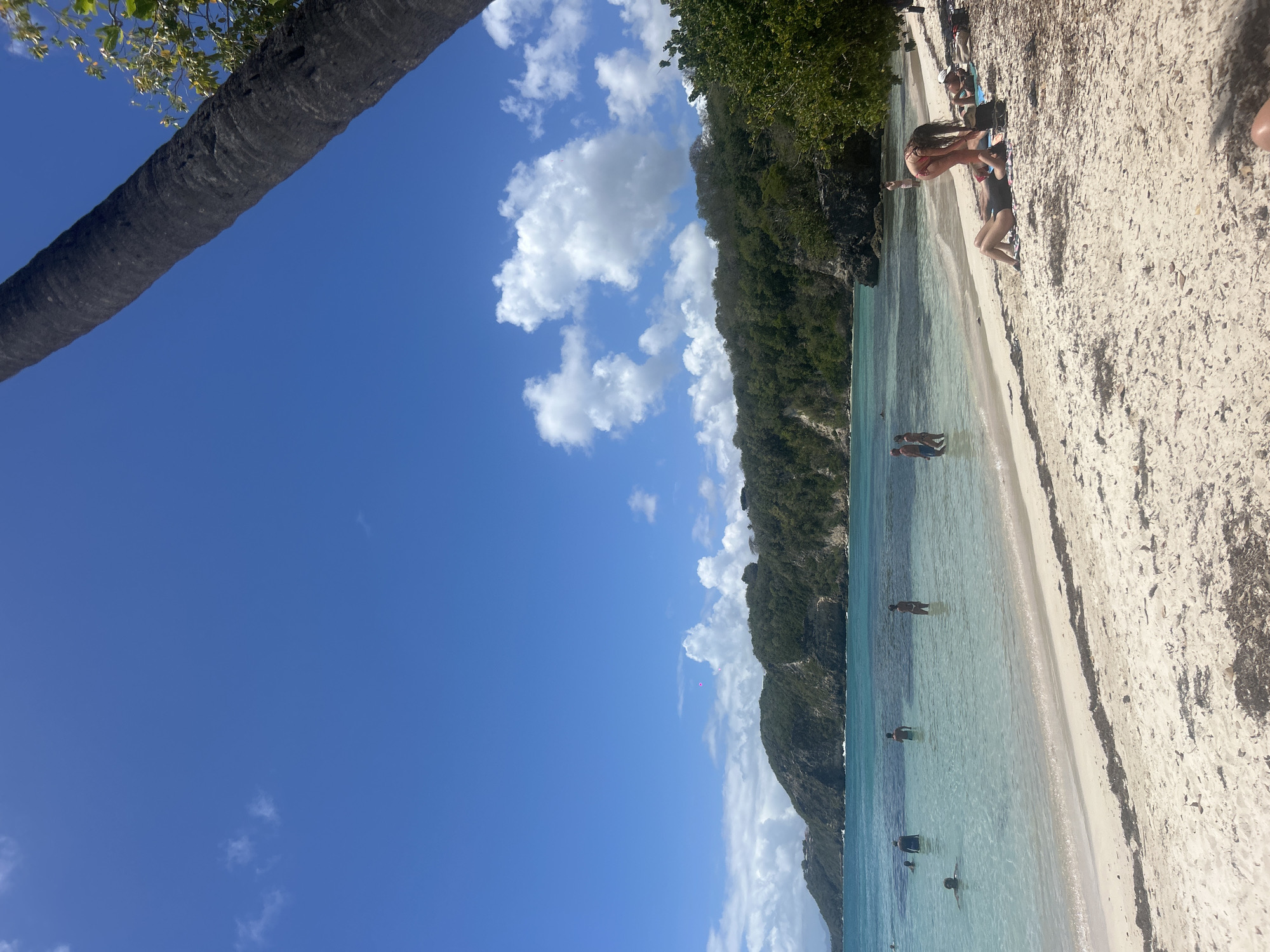 The image displays a sunny tropical beach scene located in Le Gosier, France. The upper portion of the frame features a bright blue sky with scattered white cumulus clouds. A large, dark palm tree trunk diagonally crosses the upper right corner, with green foliage visible behind it. The foreground consists of a white sandy beach, marked by lines of dark organic debris, likely seaweed or fallen leaves. On the right side of the beach, three individuals are present. One female, wearing a dark swimsuit, lies prone on a dark mat, her head partially obscured. Another female, in a light-colored bikini, stands and bends forward over the prone individual. A third person is partially visible lying prone further to the right. The water near the shore is calm, clear, and turquoise, gradually deepening to a darker blue further out. Five individuals are present in the water: one person is mostly submerged near the left edge, another stands chest-deep in a dark top, a third stands waist-deep facing away, and two individuals stand close together, waist-deep, facing each other towards the right. The background is defined by a lush, green-forested coastline featuring hills and rocky outcrops that meet the ocean.