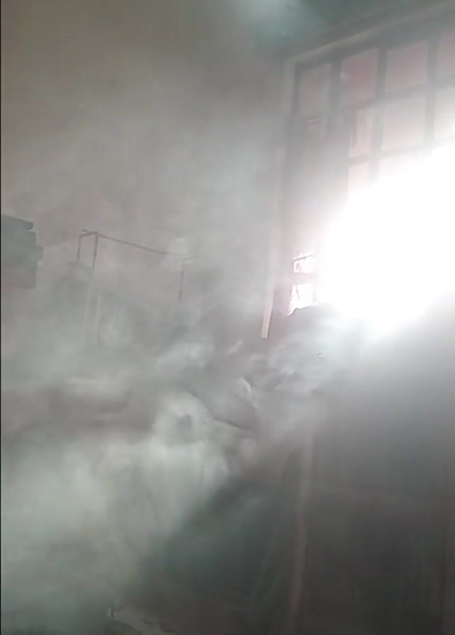 The scene is a room filled with dense white smoke. Sunlight streams in from a window with a barred frame and a red curtain. A wooden table in the foreground is cluttered with items including an ashtray, a green container, and a gray rectangular object. Behind the table, there is a shelf holding a stack of boxes, a clock, and what appears to be an old radio. There's a metal shelf structure visible amidst the smoke, and the walls are plain. The smoke obscures the details, making the exact contents of the room difficult to discern clearly.