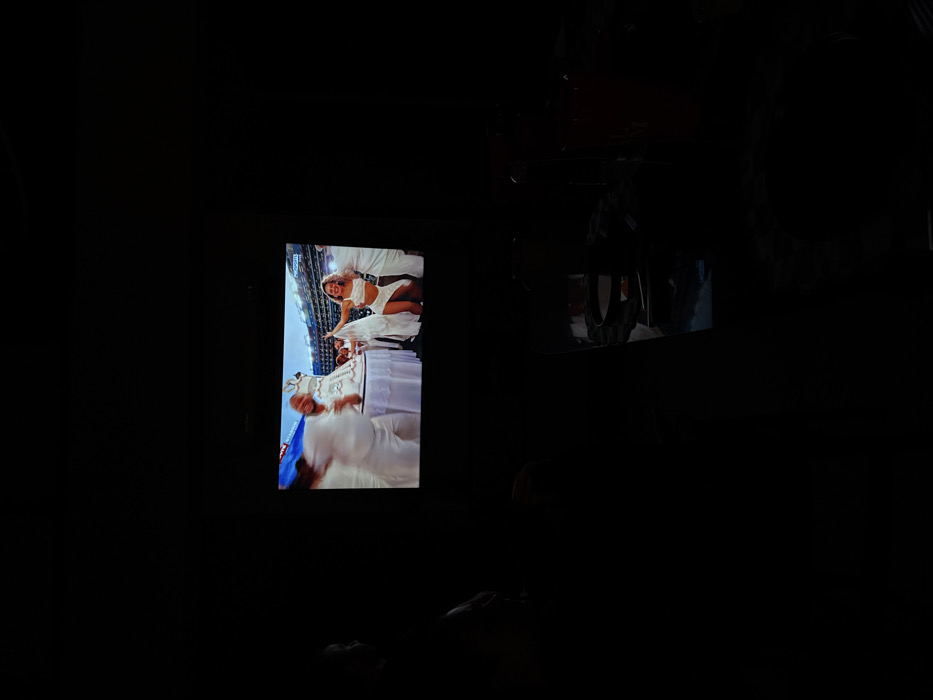 A television screen glows in a darkened room, displaying a scene with people in white. A woman with blonde hair stands smiling, while others dressed in white are positioned below her. Some of the individuals appear to be moving rapidly. A distorted reflection is visible on a surface behind the television. Below the screen, a dark and indistinct form hints at the presence of a person or object in the foreground.